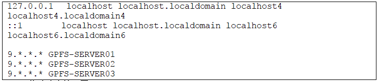 在客戶端修改/etc/hosts,加入GPFS的三台服務器,同時確保所有服務器和客戶端可以免密碼登陸,具體設置方法可以參考本章GPFS安裝與配置。