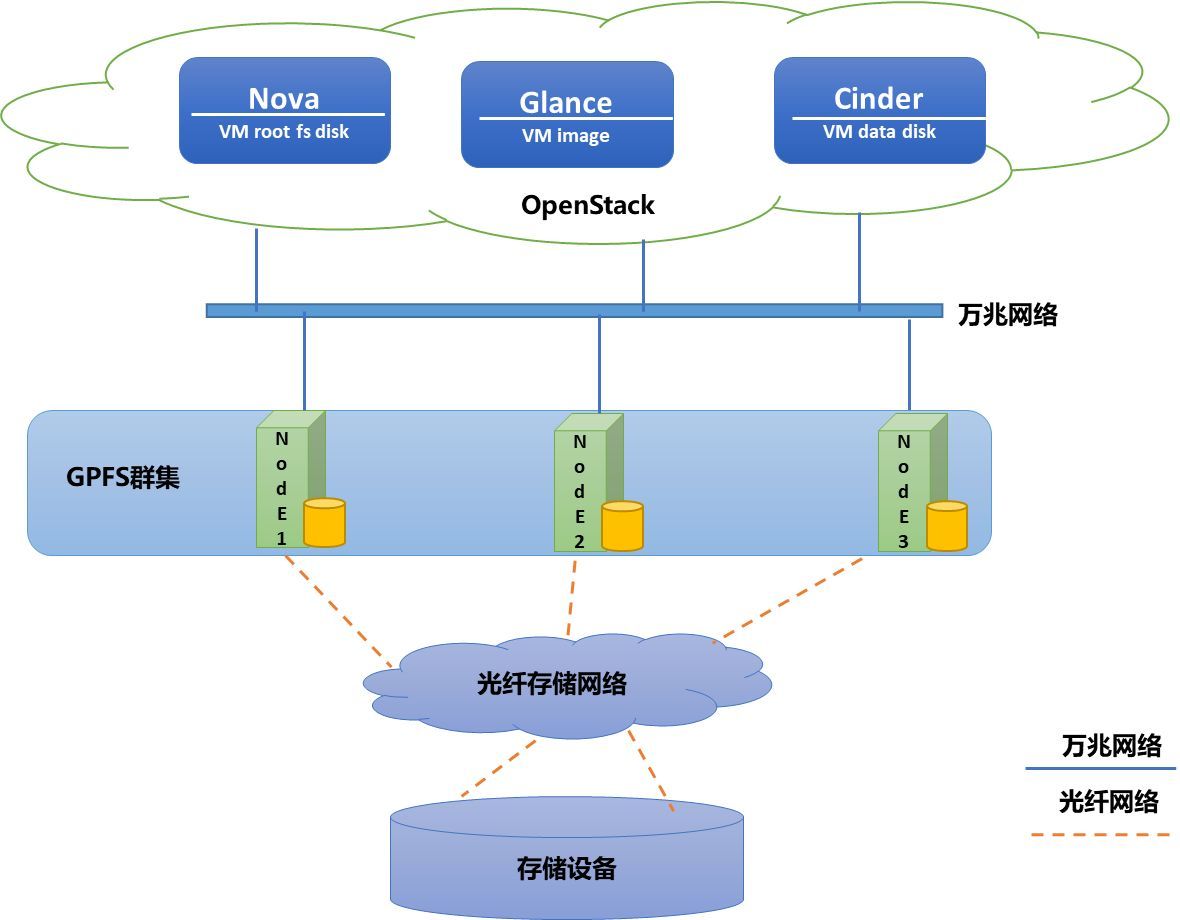 通過GPFS群集劃分三塊共享卷給OpenStack雲環境,分別掛載到Nova節點,作為VM的存儲,Glance節點作為鏡像的存儲,Cinder節點,作為實例數據盤的存儲。