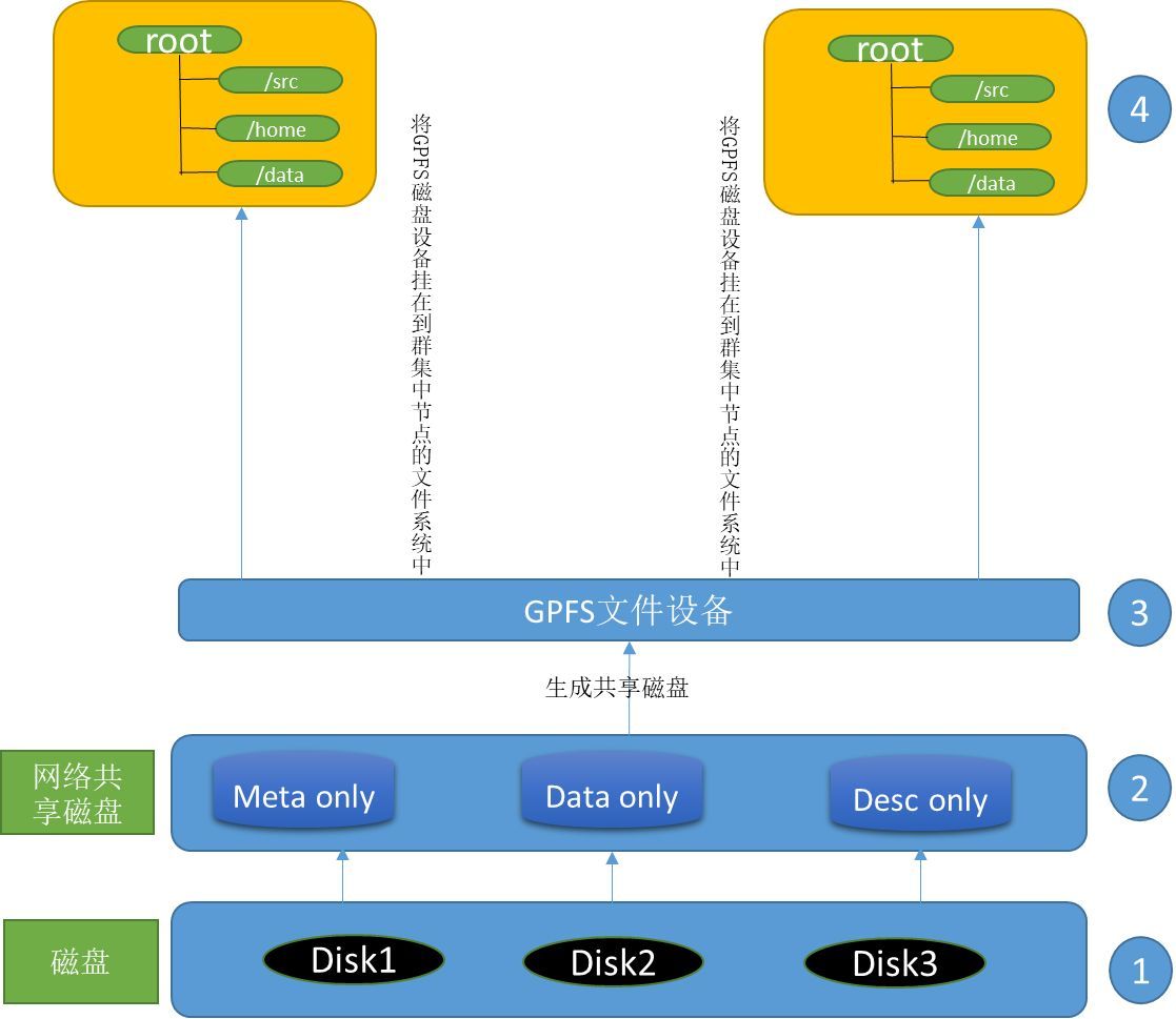 本地磁盤將被發現並添加到全局的命名空間中,形成網絡共享盤(NSD),供群集調用。