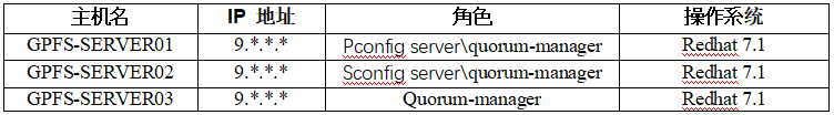 由於受到硬件資源限製,測試環境將采用三台服務器進行部署,並且每台服務器上已經掛載從SAN劃分的物理卷,每台服務器角色均為GPFS的存儲節點,同時一台是主配置服務器,一台是輔助配置服務器,詳細信息如表 1 所示。