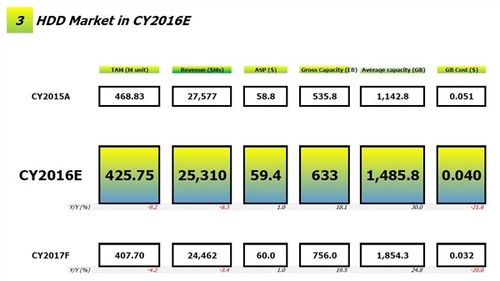 2015年,全年出貨容量為535.8EB,2016年為633EB,預計2017年會進一步擴大至756EB。因為,2015年時平均每塊硬盤的容量為1142.8GB、2016年就增加到了1485.8GB,預計2017年將達到1854.3GB。