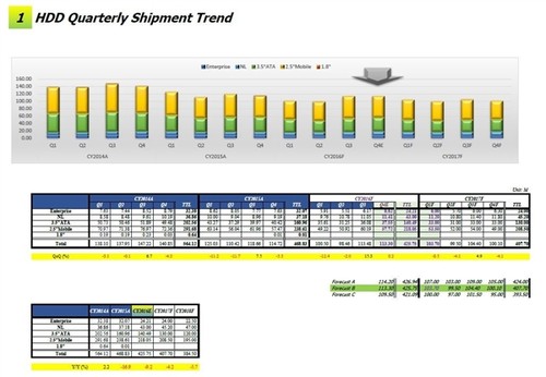 會議上給出數據顯示,硬盤出貨量自2010年達到峰頂的6.5億塊以來一直呈現下跌趨勢,2016年出貨量僅為4.25億塊,比2015年減少了9.2%,相比2010年更是下跌了35%之巨。
