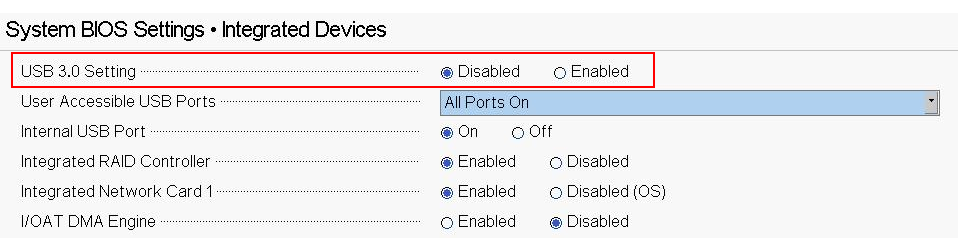 如圖" System Setup( 係統設置 ) "中 , 確保 USB3.0 集成設備設置屏幕上的選項設置為 "Disable"( 禁用 ) 。注 : 默認情況下 , USB3.0 選項是禁用的。如果設置為 Enabled( 啟用 ), 操作係統不會檢測到USB 設備 , 如鍵盤、鼠標和 USB DVD 。注 :Windows Server2008R2SP1 支持 額外添加USB3.0 驅動程序 , 並可以在 dell.com/support 下載, 請確保您安裝操作係統後 , 安裝驅動程序。注 : 請確保您先安裝好驅動程序 , 然後重新啟動係統 , 進入係統設置程序。在係統設置程序中 , 啟用 USB3.0 集成設備選項。